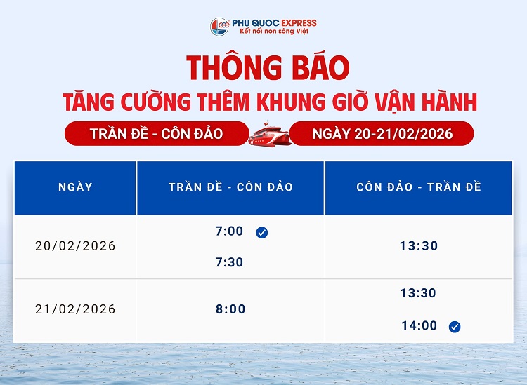 Nhằm đáp ứng nhu cầu đi lại ngày càng tăng của Quý hành khách, Công ty Cổ phần Tàu cao tốc Phú Quốc (Phú Quốc Express) thông báo bổ sung thêm khung giờ vận hành trên một số tuyến, cụ thể:
