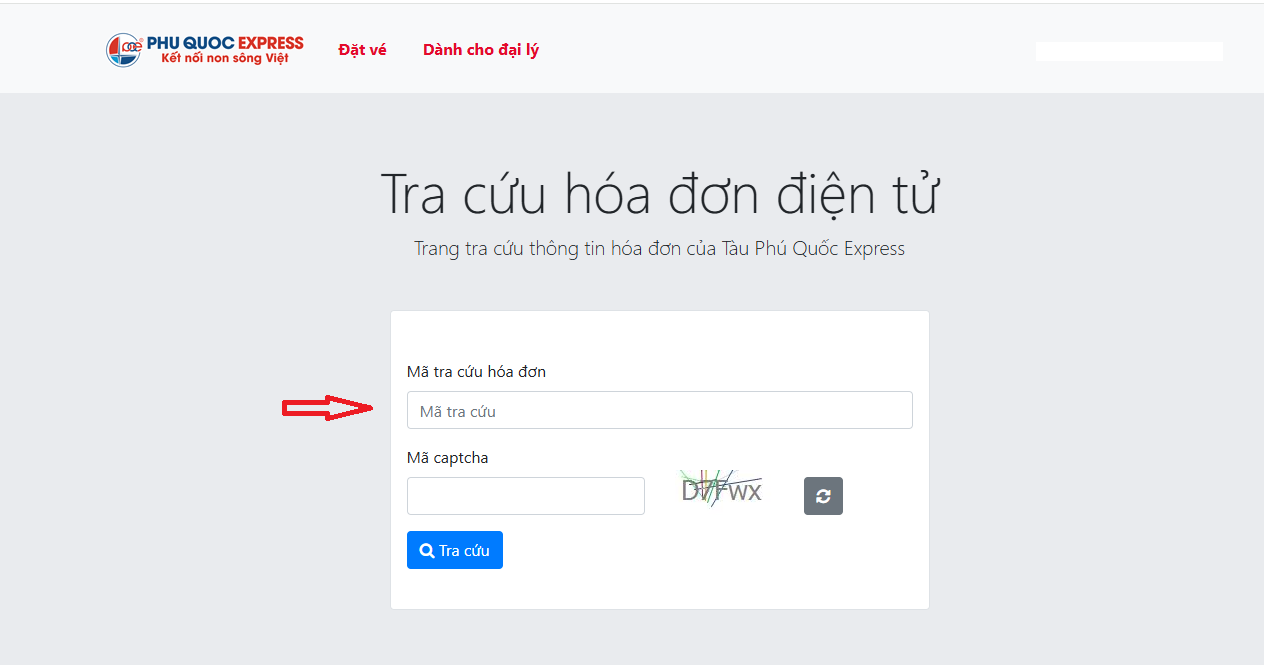 Tra cứu hoá đơn tàu Phú Quốc Express: Bao gồm đội tàu: Tàu Phú Quốc Express, tàu cao tốc Thăng Long, tàu Trưng Nhị/Côn Đảo Express 36, tàu Trưng Trắc) tại: http://tracuuhoadon.phuquocexpress.com/ → nhập “Mã tra cứu hóa đơn” → mã captcha → chọn “tra cứu”.