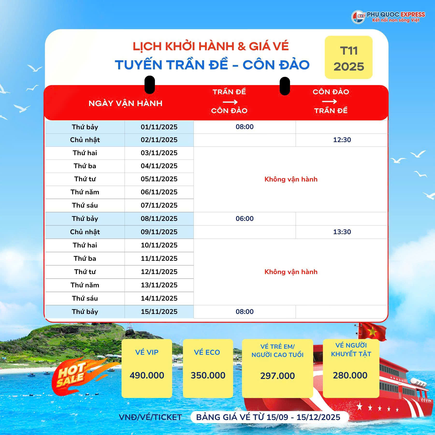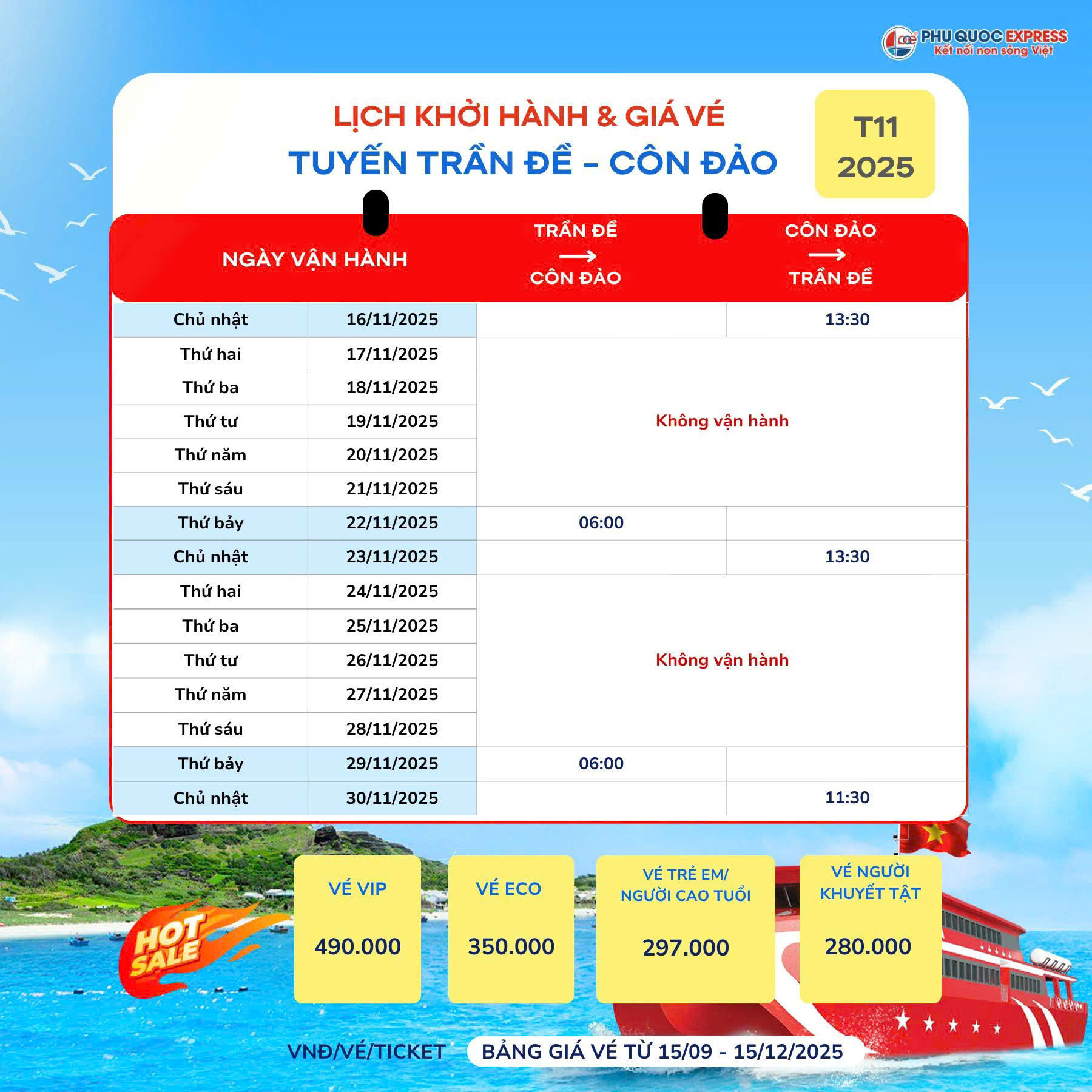 Tàu cao tốc Trưng Nhị xin thông báo tới Quý khách hàng lịch tàu Trần Đề - Côn Đảo tháng 11: